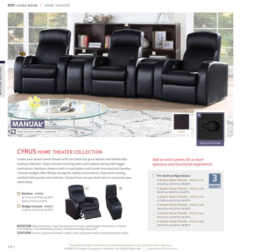 FEATURES: Manual Recline / Two Cup Holders Per Seat / Wall Hugger Mechanism / Pocket